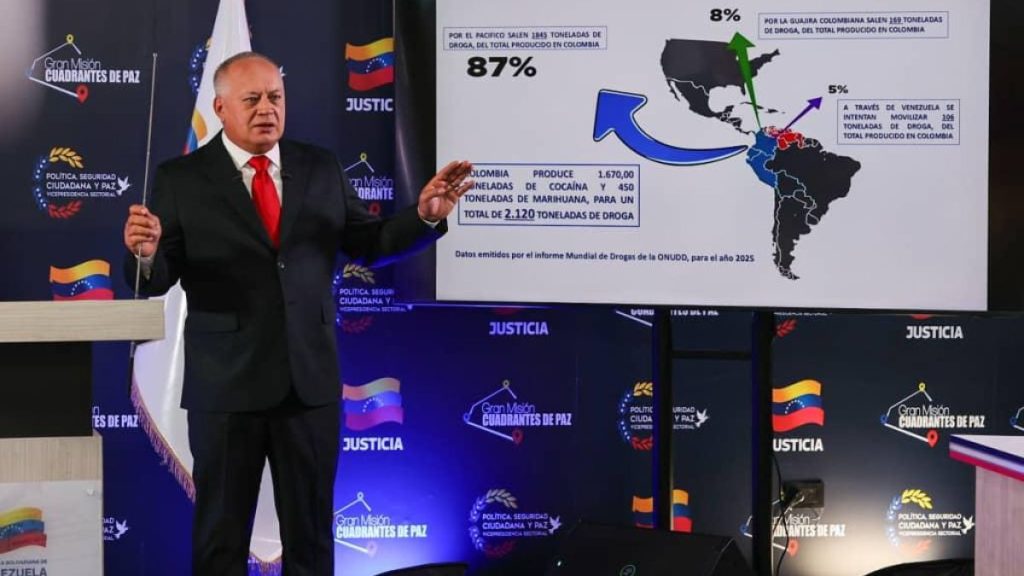 El vicepresidente sectorial de Política, Seguridad y Paz, Diosdado Cabello, informó que el informe de la Organización de las Naciones Unidas (ONU) sobre las rutas del narcotráfico en la región americana indica que «la mayor cantidad de droga se produce en territorio colombiano».