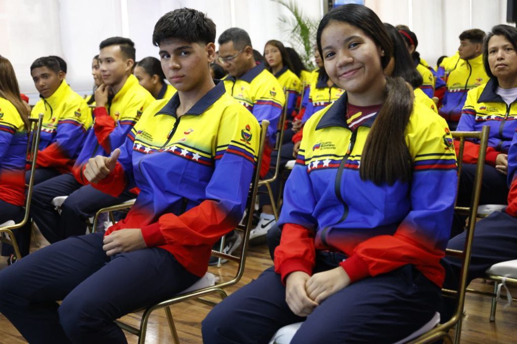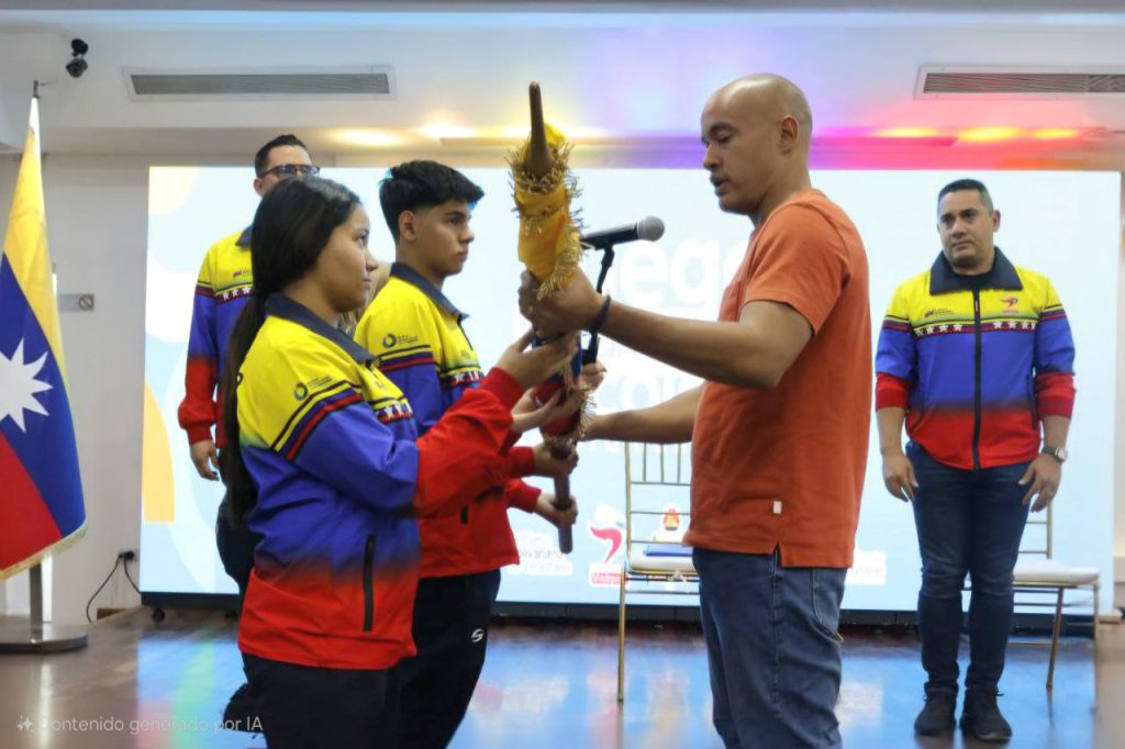 Desde el salón Morochito Rodríguez, en la sede del Ministerio de Deporte, los atletas Paola Zerpa (tenis de mesa) y Adanuriel Rosal (natación) recibieron la bandera de manos del vicepresidente sectorial para el Socialismo Social y Territorial, Héctor Rodríguez, y del ministro de Deporte, Arnaldo Sánchez.