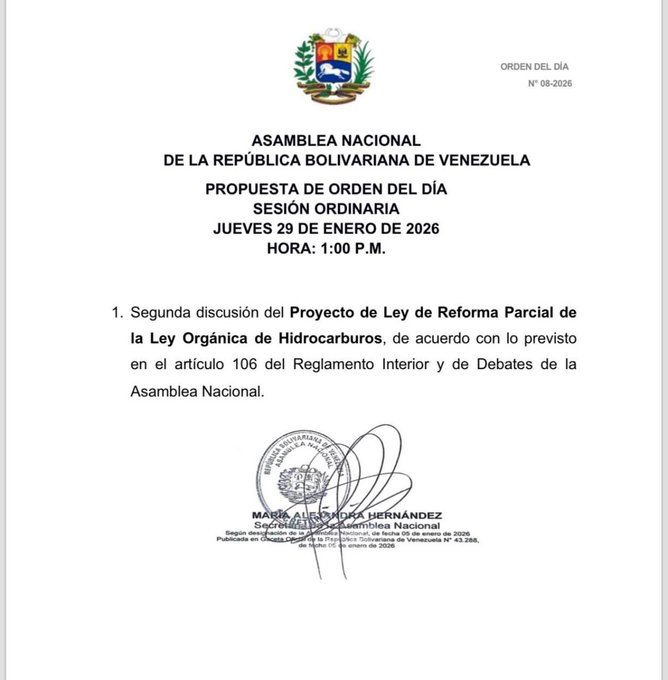 La Asamblea Nacional (AN) convocó a la plenaria este jueves 29 de enero para abordar en segunda discusión el proyecto de reforma parcial de la Ley de Hidrocarburos, como punto único de la sesión.