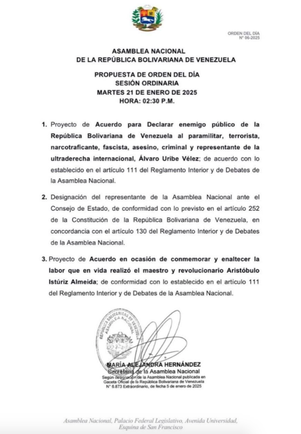 La Asamblea Nacional (AN) realizará una sesión ordinaria este martes para debatir tres puntos; entre estos, el proyecto de acuerdo para declarar como enemigo público de Venezuela al expresidente colombiano Álvaro Uribe Vélez, quien previamente solicitó una intervención militar extranjera contra la nación Bolivariana para destituir al presidente constitucional y democráticamente electo, Nicolás Maduro.