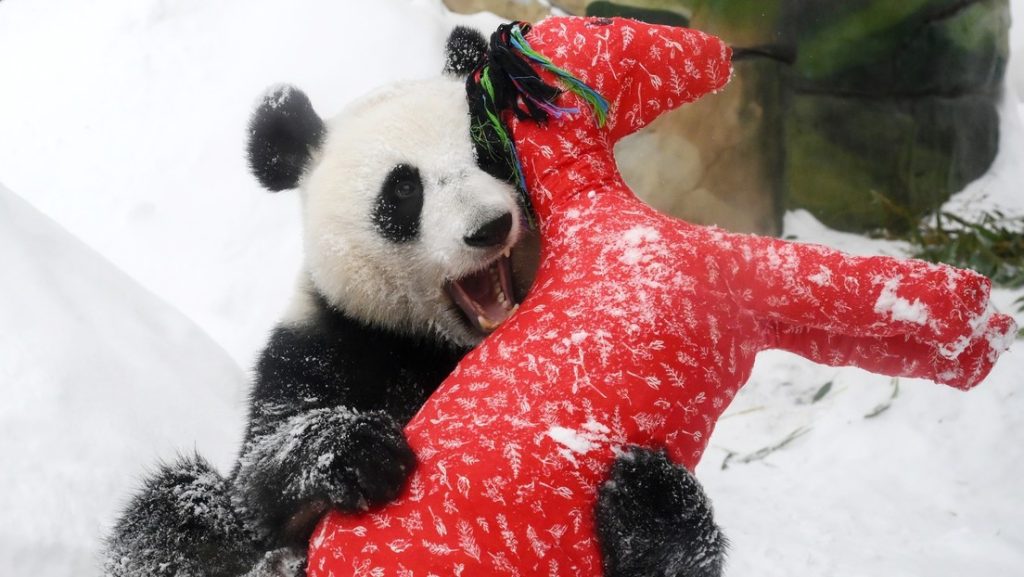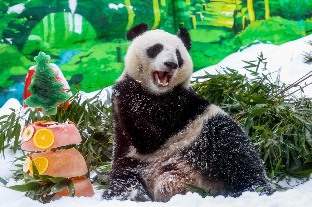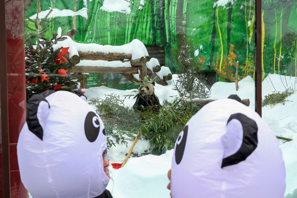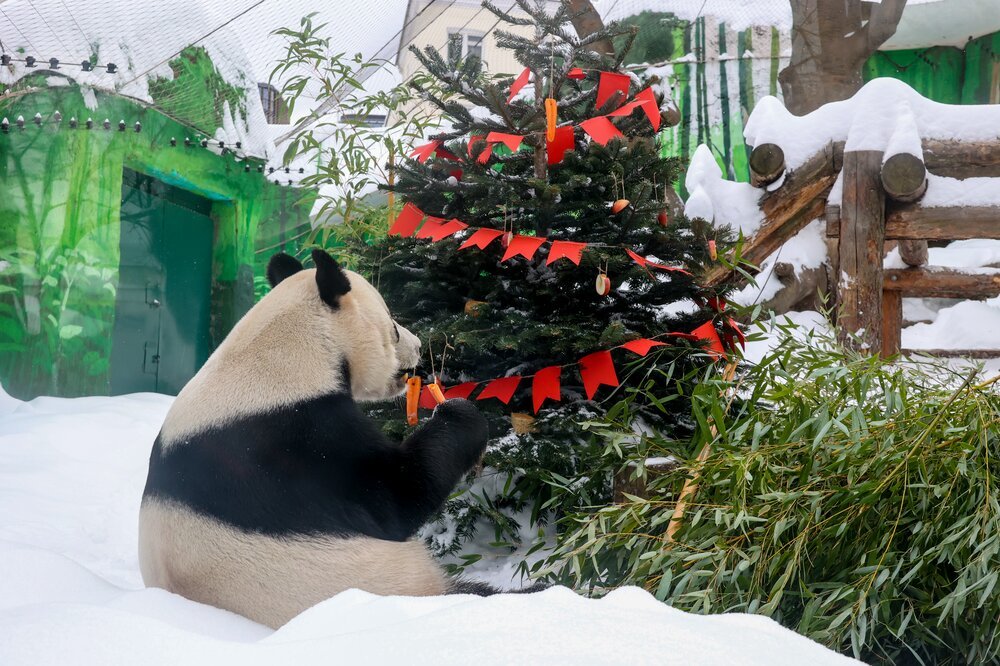 Los pandas gigantes Rui y Katyusha del Zoológico de Moscú celebraron el Año Nuevo Chino con regalos especiales: Katyusha recibió un juguete hecho con una paca de heno y un pastel de frutas glaseado, mientras que para Rui se construyó un caballo de bambú.