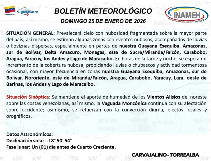 Este domingo prevalecerá cielo con nubosidad fragmentada sobre la mayor parte del país. Asimismo, se estiman algunas zonas con eventos nubosos, acompañados de lluvias o lloviznas dispersas, especialmente en partes de la Guayana Esequiba, Amazonas, sur de Bolívar, Delta Amacuro, Monagas, este de Sucre/Miranda/Falcón, Carabobo, Aragua, Yaracuy, los Andes y Lago de Maracaibo.