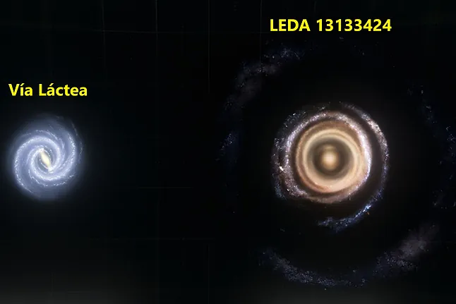 LEDA tiene un gran diámetro, unos 250.000 años luz, aproximadamente 2,5 veces mayor que el de nuestra Vía Láctea. Por supuesto, se conocen muchas otras galaxias de forma anular, pero todas las observadas anteriormente presentan tres anillos como máximo.
