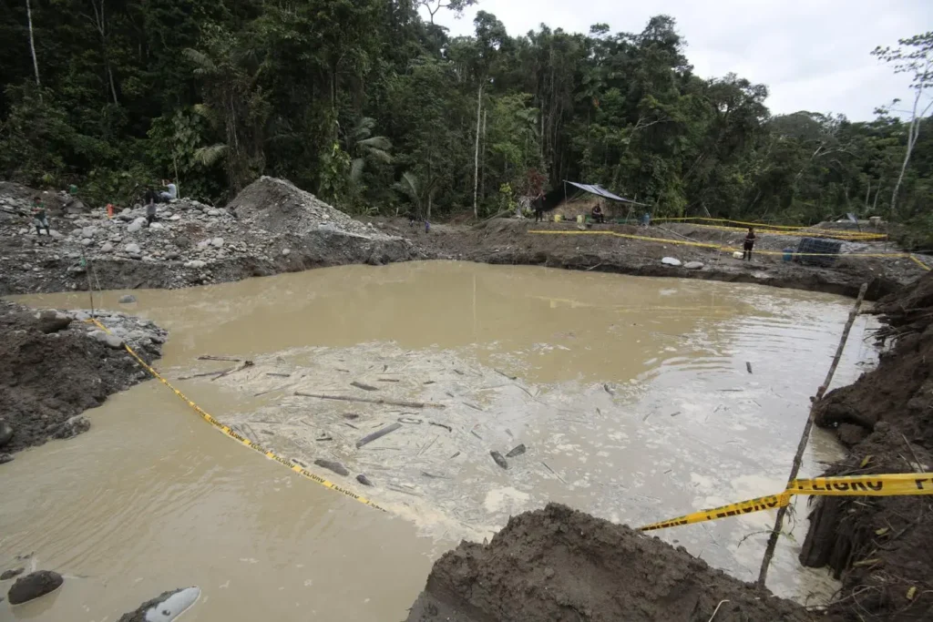 La inspección, efectuada el 15 de abril de 2026 por las guardias comunitarias “Tayak Runakuna” y “Nee Wanonani Meñebai”, permitió identificar un área de explotación minera de aproximadamente una hectárea, donde se evidenció actividad extractiva con maquinaria pesada. En el sitio se localizaron cinco piscinas contaminantes con presencia de metales pesados como mercurio, además de vertidos de diésel provenientes de retroexcavadoras y bombas de succión.