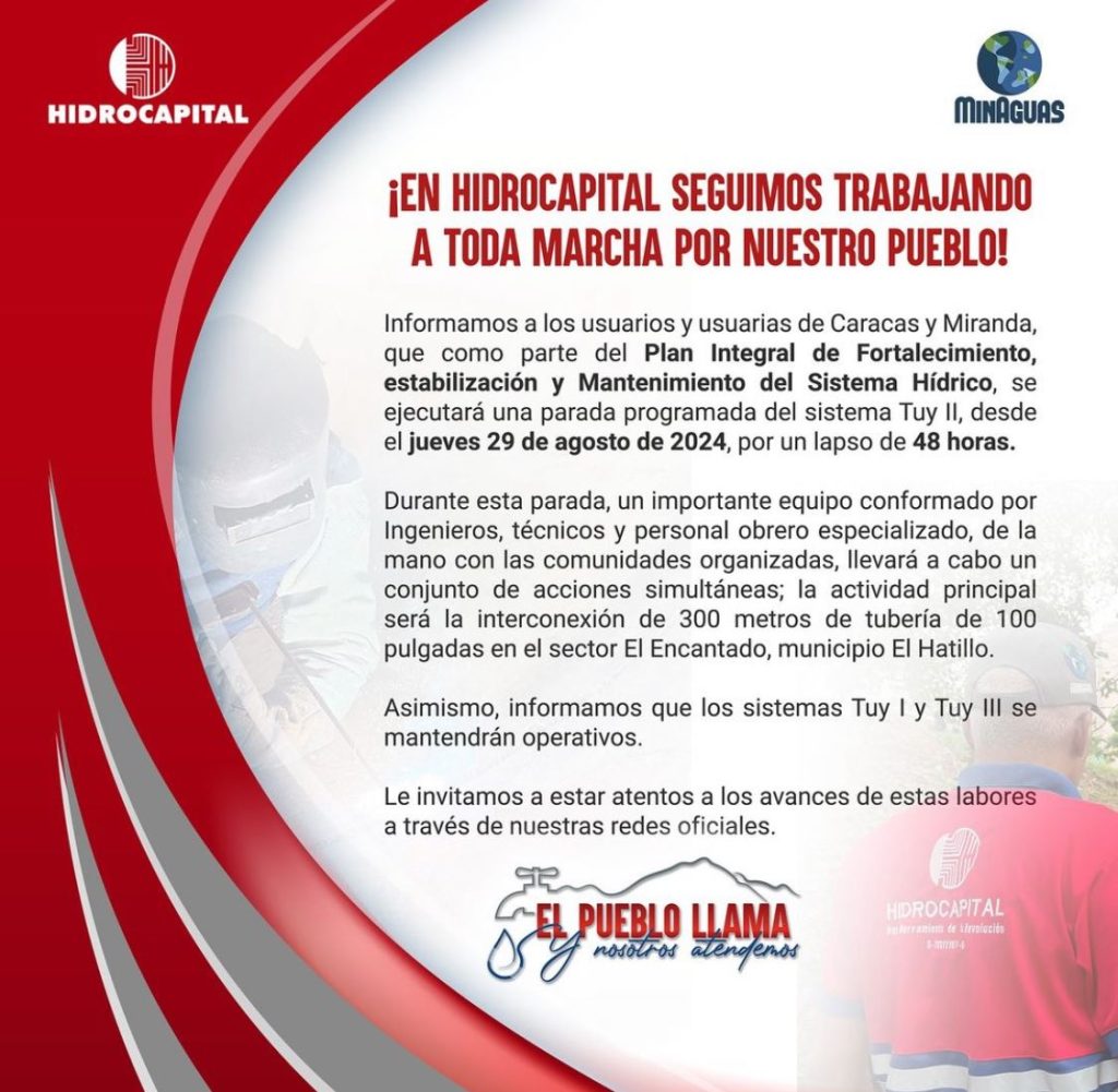 “Durante esta parada, un importante equipo conformado por ingenieros, técnicos y personal obrero especializado, de la mano con las comunidades organizadas, llevará a cabo un conjunto de acciones simultáneas; la actividad principal será la interconexión de 300 metros de tubería de 100 pulgadas en el sector El Encantado, municipio El Hatillo”, indicó la empresa estatal en un comunicado divulgado por redes sociales.