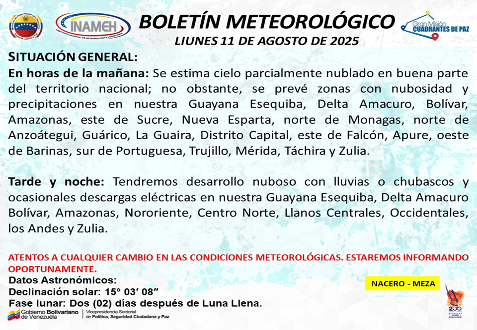 Este lunes 11 de agosto en horas de la mañana se estima cielo parcialmente nublado en buena parte del territorio nacional; no obstante, se prevé zonas con nubosidad y precipitaciones en la Guayana Esequiba, Delta Amacuro, Bolívar, Amazonas, este de Sucre, Nueva Esparta, norte de Monagas, norte de Anzoátegui, Guárico, La Guaira, Distrito Capital, este de Falcón, Apure, oeste de Barinas, sur de Portuguesa, Trujillo, Mérida, Táchira y Zulia, reseña el boletín de las autoridades del Instituto Nacional de Meteorología e Hidrología (Inameh).
