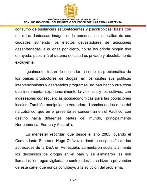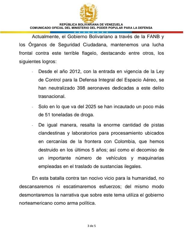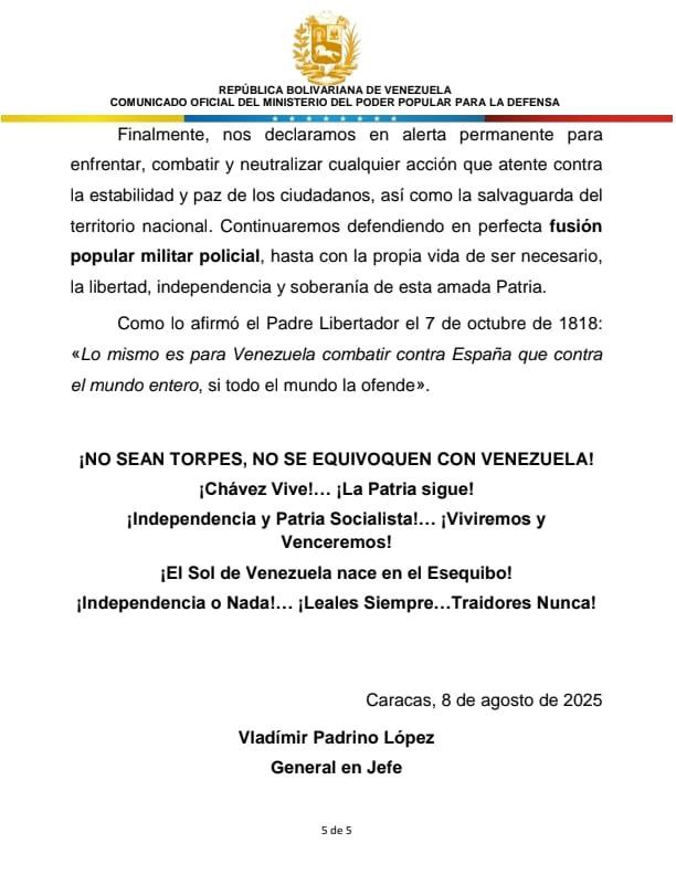 Por otra parte, en declaraciones ofrecidas desde el Ministerio de la Defensa, destacó que Venezuela celebró unas elecciones municipales (27 de julio) que cierran un ciclo constitucional en absoluta paz, «lo cual ha generado incomodidad al gobierno de Donald Trump; puesto que el mismo no quiere ver al país unido».