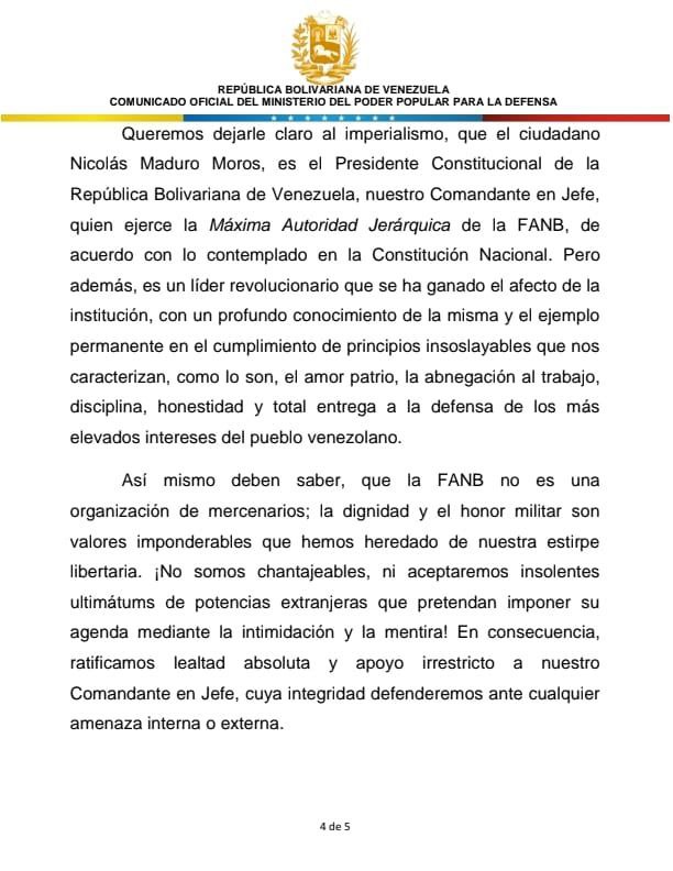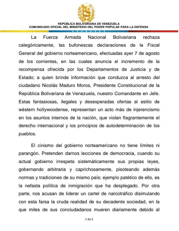 El vicepresidente sectorial de Defensa y Soberanía, Vladimir Padrino, leyó un comunicado mediante el cual la Fuerza Armada Nacional Bolivariana (FANB) rechaza la nueva ofensiva del gobierno de Estados Unidos (EEUU) contra el presidente Nicolás maduro.