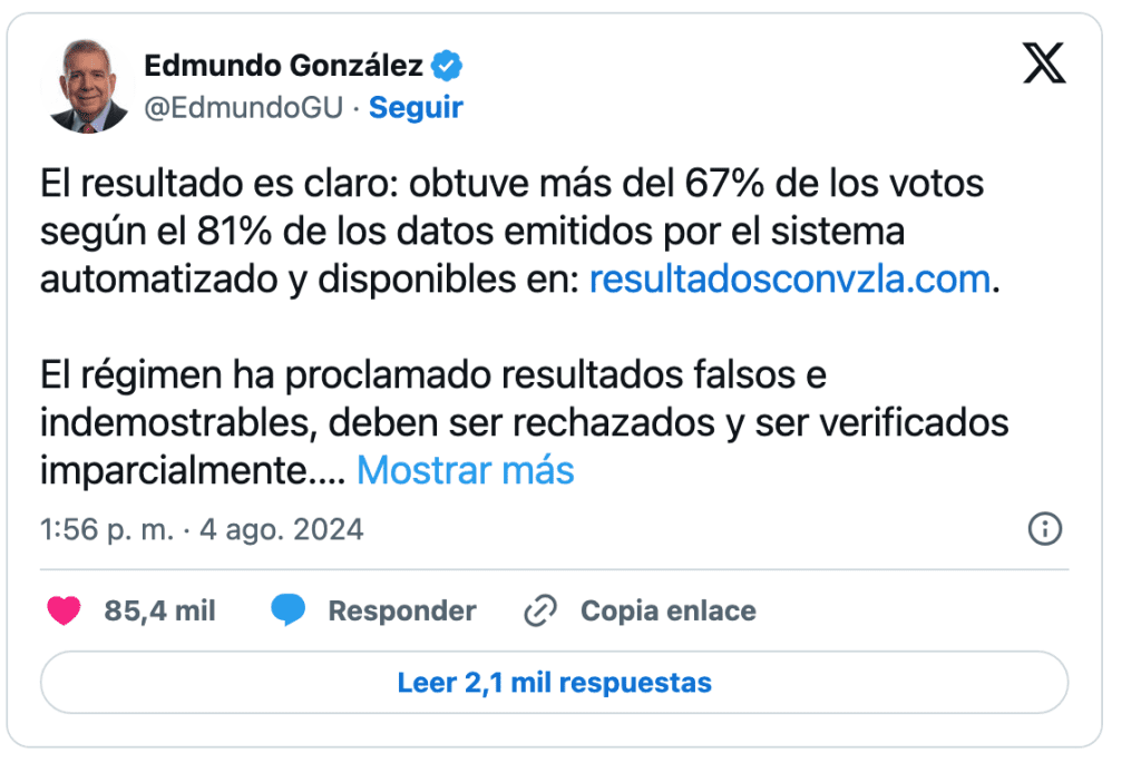 El excandidato de la Plataforma Unitaria Democrática (PUD), Edmundo González Urrutia, dijo este miércoles que “no tuvo nada que ver” con la página web resultadosconvzla.com donde se publicaron supuestos resultados de la elección presidencial del 28 de julio.