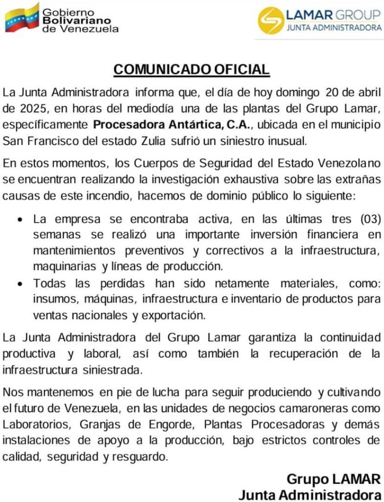 En este sentido, la Junta Directiva de Lamar informa que estará garantizando la «continuidad productiva y laboral», así como la reconstrucción de la infraestructura siniestrada.