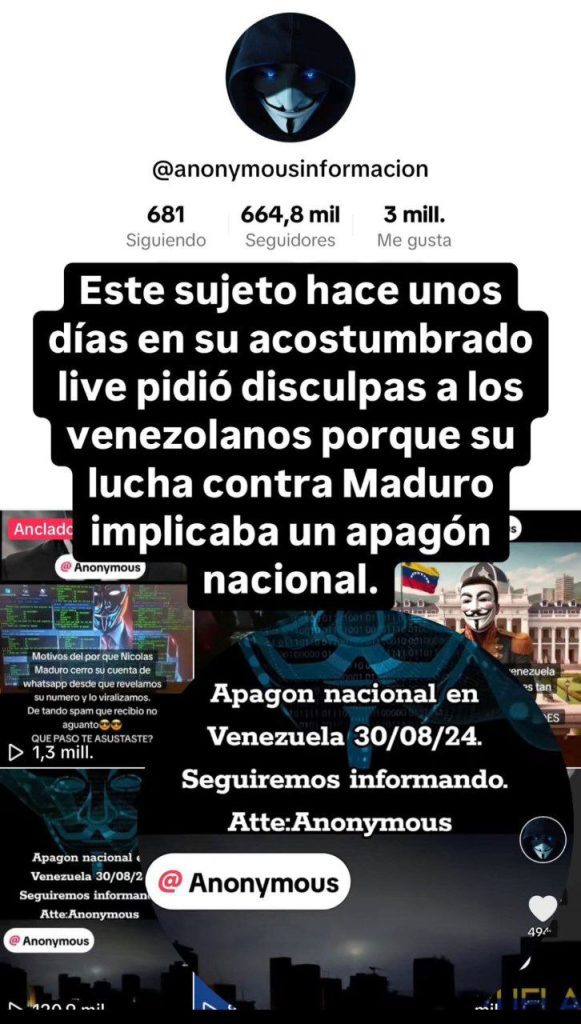 Asimismo, desde otra cuenta identificada como @anonymusinformación, anunciaba un apagón nacional en Venezuela el 30/8/2024.