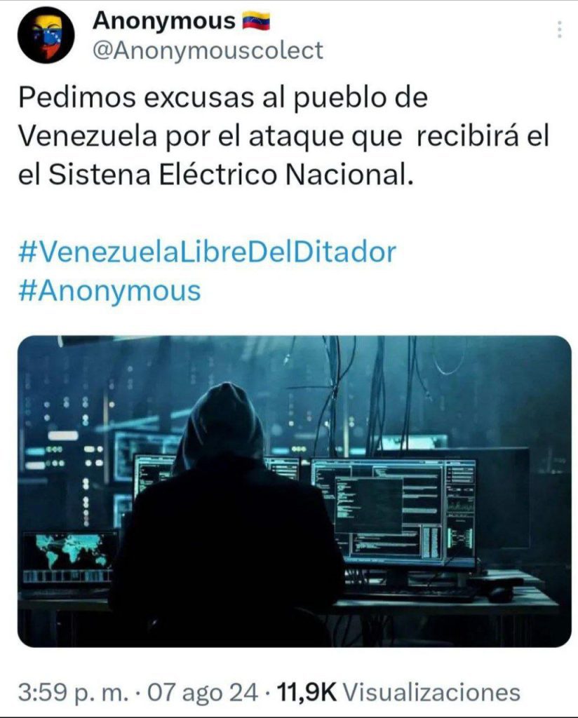 Por otra parte, Maduro manifestó que “la cuenta Anonymous al servicio de la guerra del odio contra Venezuela amenazó en varias con un apagón nacional”, haciendo hincapié en que el grupo de hackers Anonymus había publicado un mensaje en la red social X, en el que advertía sobre un inminente ataque al sistema eléctrico venezolano. En su mensaje, Anonymus pedía disculpas al pueblo venezolano por el ataque que recibiría el SEN.