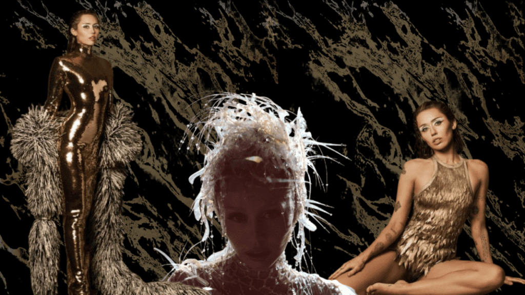 En ella se observa a Cyrus en primer plano con un atuendo de Thierry Mugler, de 1997, que enmarca su cara con un tocado vanguardista de cristales transparentes.