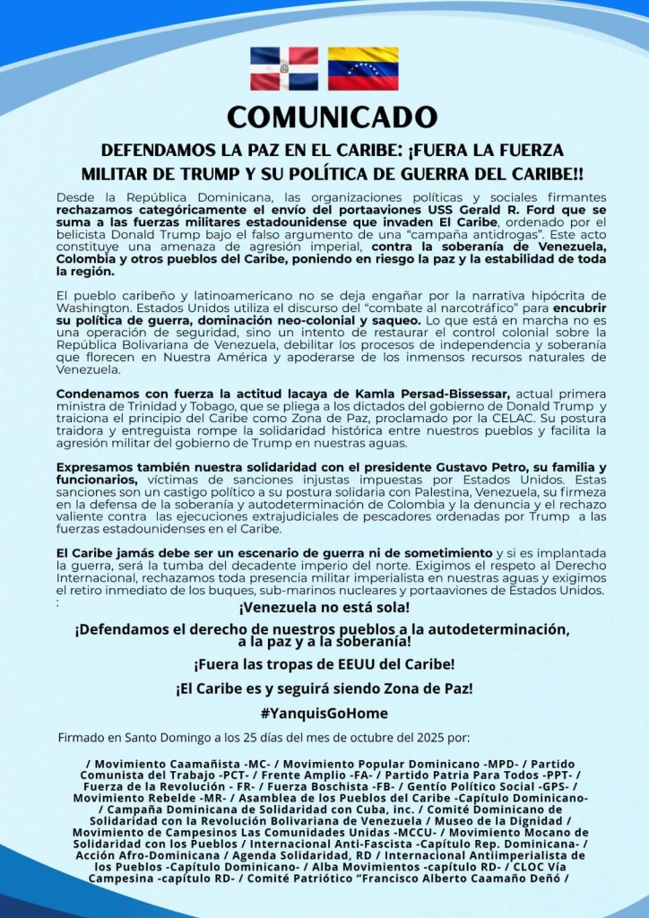 Desde República Dominicana, las organizaciones políticas y sociales condenaron mediante un comunicado el envío del portaviones USS Gerald R. Ford, que se suma a las fuerzas militares estadounidense que se encuentran en el Caribe, ordenado por el presidente Donald Trump.