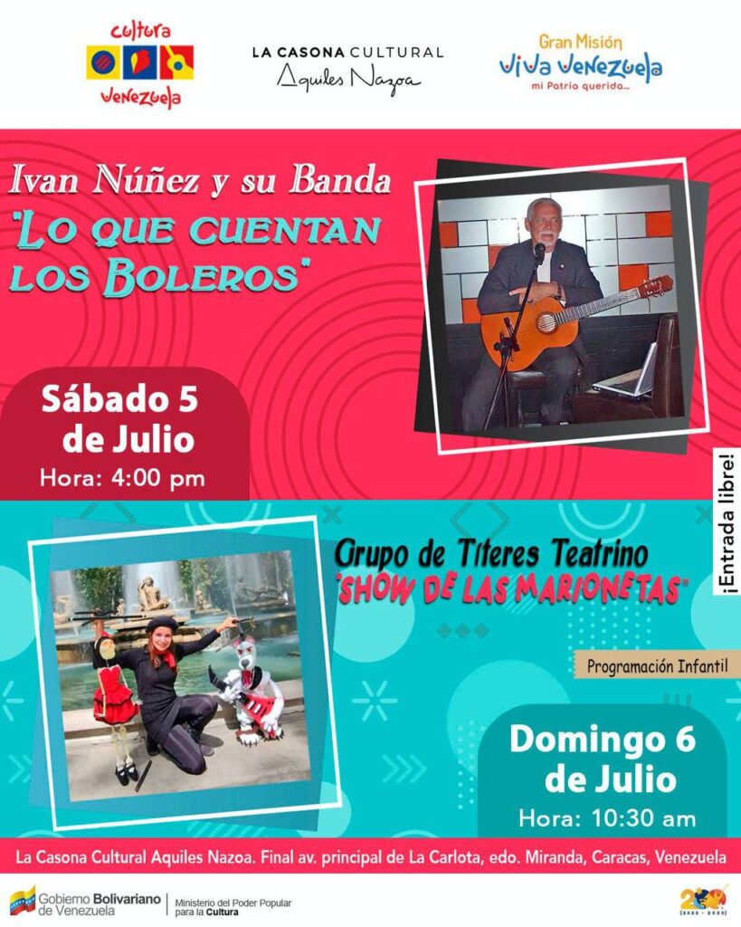 El sábado 5 de julio la Casona Cultural Aquiles Nazoa se llenará de romanticismo y alegría con la presentación de Iván Núñez y su banda Lo que cuentan los boleros. El concierto comenzará a las 4:00 de la tarde. Este espectáculo promete ser una experiencia emotiva tanto para los amantes de la música como para aquellos que deseen explorar la riqueza de este género.