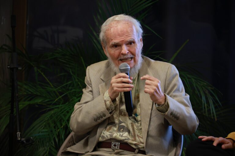 El escritor venezolano durante su intervención agradeció el homenaje calificándolo que es “más una muestra de afecto y amistad que de mérito propio”. Habló sobre su obra que conserva total independencia de intereses de poder y aprovecho la oportunidad para envío un mensaje “tenemos que hacer una utopía en la Tierra. Que todo el mundo disponga la mayor parte del tiempo libre para el disfrute y la creación para satisfacer sus necesidades» dijo.
