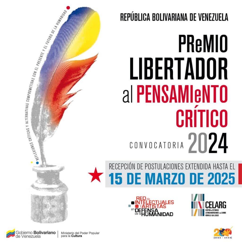 El Ministerio del Poder Popular para la Cultura, el Centro de Estudios Latinoamericanos y del Caribe Rómulo Gallegos (Celarg) y la Red de Intelectuales y Artistas en Defensa de la Humanidad extienden la convocatoria al Premio Libertador al Pensamiento Crítico en su XIII edición hasta el 15 de marzo de este año.