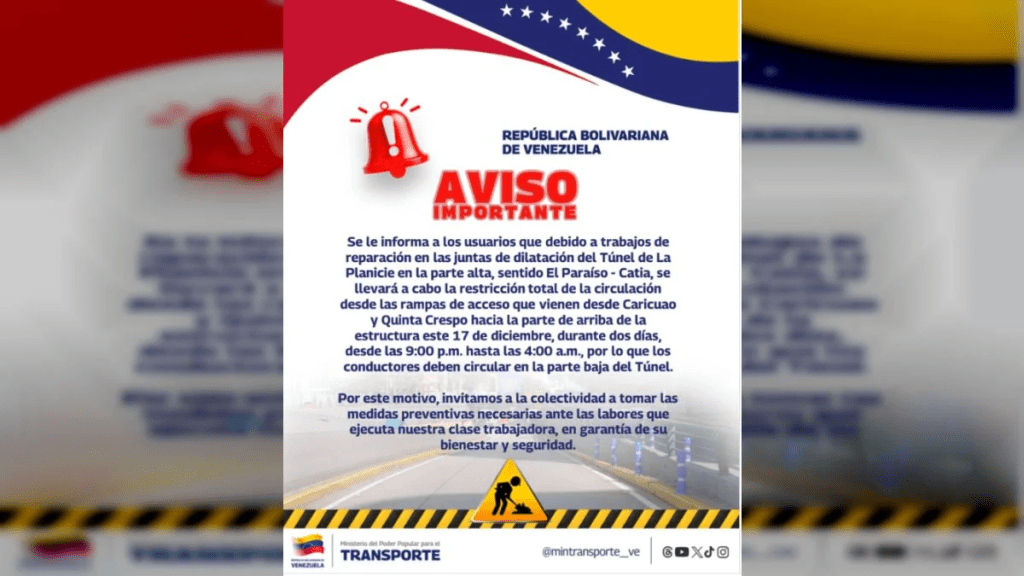 El Gobierno Bolivariano a través del Ministerio para el Transporte anunció que realizará trabajos de reparación en las juntas de dilatación del Túnel de La Planicie en la parte alta, sentido El Paraíso – Catia, en Caracas.