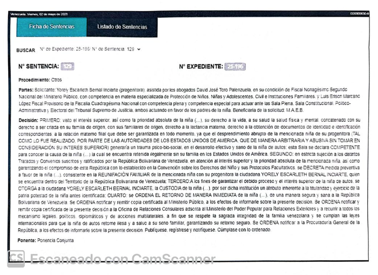 «Se ORDENA notificar y remitir copia certificada de la presente decisión a la Oficina de Relaciones Consulares adscrita al Ministerio del Poder Popular para Relaciones Exteriores y a recurrir a todos los mecanismo legales, políticos, diplomáticos y de acciones multilaterales, a fin que se respete la sagrada integridad de la familia venezolana y se cumplan las leyes internacionales para que la niña de autos retorne ilesa y a salvo a su seno familiar, garantizando su retorno seguro. Se ORDENA notificar a la Procuraduría General de la República, a los efectos de informarle sobre la presente decisión. Publíquese, regístrese y notifíquese. Cúmplase con lo ordenado», se lee en la sentencia 120 de la Sala Social del TSJ este viernes 2 de mayo del año en curso.
