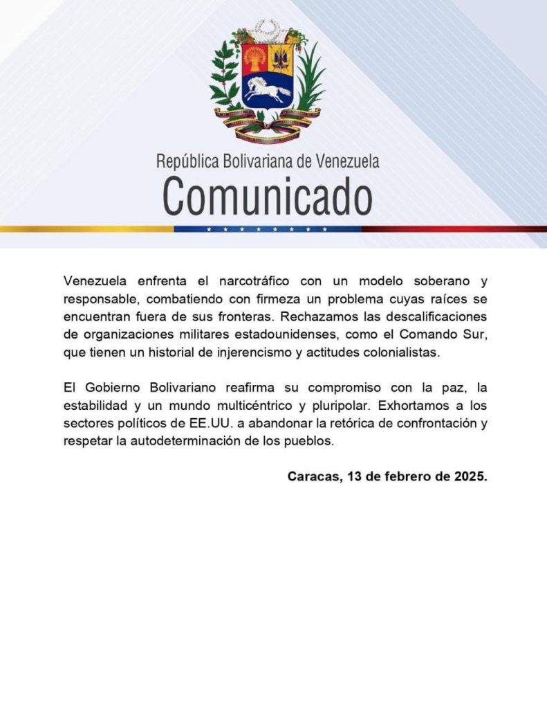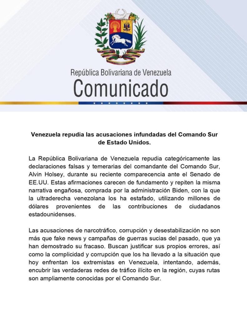 Venezuela repudia categóricamente las «declaraciones falsas y temerarias» del comandante del Comando Sur, Alvin Holsey, durante su reciente comparecencia ante el Senado de EEUU, así lo expresó el ministro de Comunicaciones, Freddy Ñáñez, al momento de compartir en Telegram un comunicado.