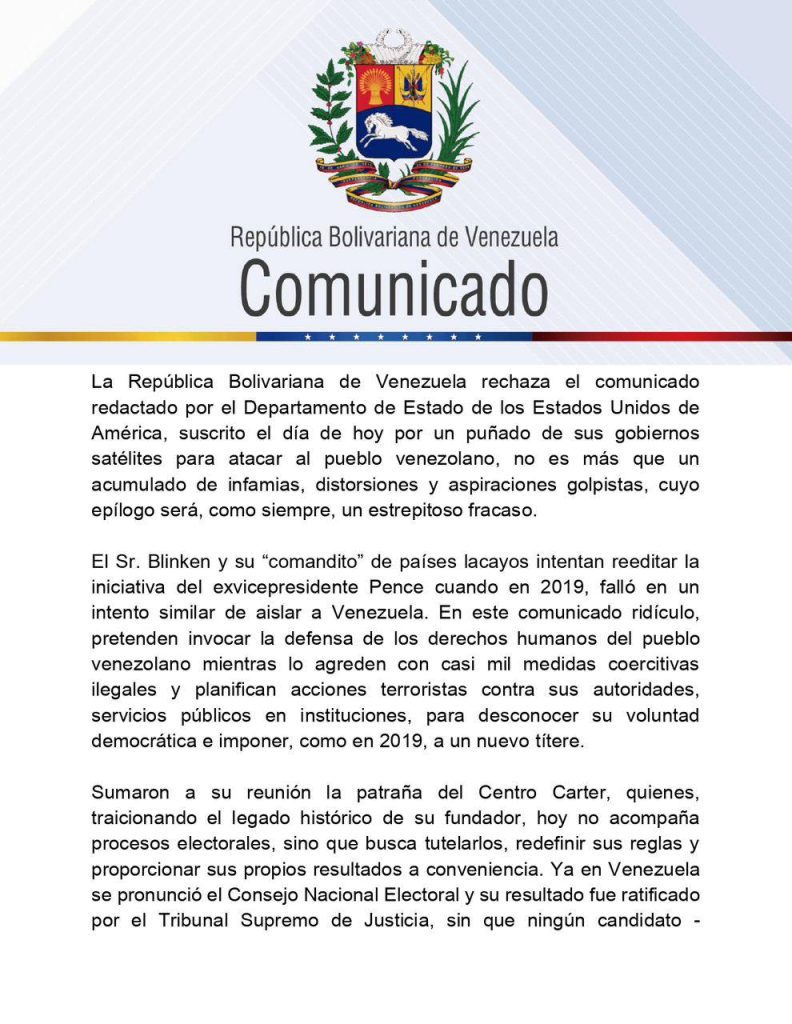 El gobierno de Venezuela rechazó el comunicado emitido por el Departamento de Estado de Estados Unidos (EEUU) tras la reelección del presidente Nicolás Maduro en las elecciones del pasado 28 de julio. La Cancillería venezolana calificó el texto como un «acumulado de infamias, distorsiones y aspiraciones golpistas».