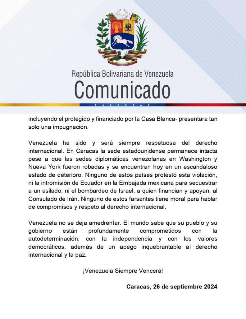 Aseguran que a pesar de los ataques constantes, el gobierno venezolano mantiene su compromiso con el derecho internacional y la autodeterminación de los pueblos y concluyen el texto con la frase: «Venezuela no se deja amedrentar».