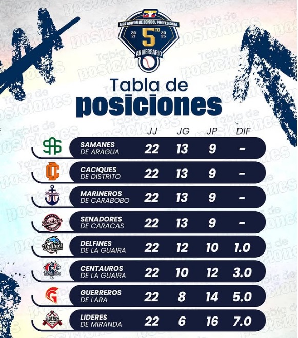 Durante la jornada de este jueves, Senadores de Caracas y Caciques de Distrito Capital lograron sendas victorias que los catapultaron al primer lugar de la tabla de clasificación de la Liga Mayor de Béisbol Profesional (LMBP) que ahora comparten con Samanes de Aragua y Marineros de Carabobo.